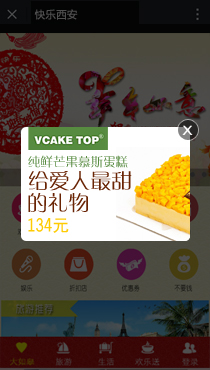 根据Vcake受众人群特点,制定了移动广告投放方案,选择在西安当地美食类媒体(插屏广告)、qq客户端聊天框(图片广告)、本地化O2O(广告推送)三种方式进行广告投放。在投放过程中,不断监测广告转化数据,调整广告创意方案和产品内容页创意。
