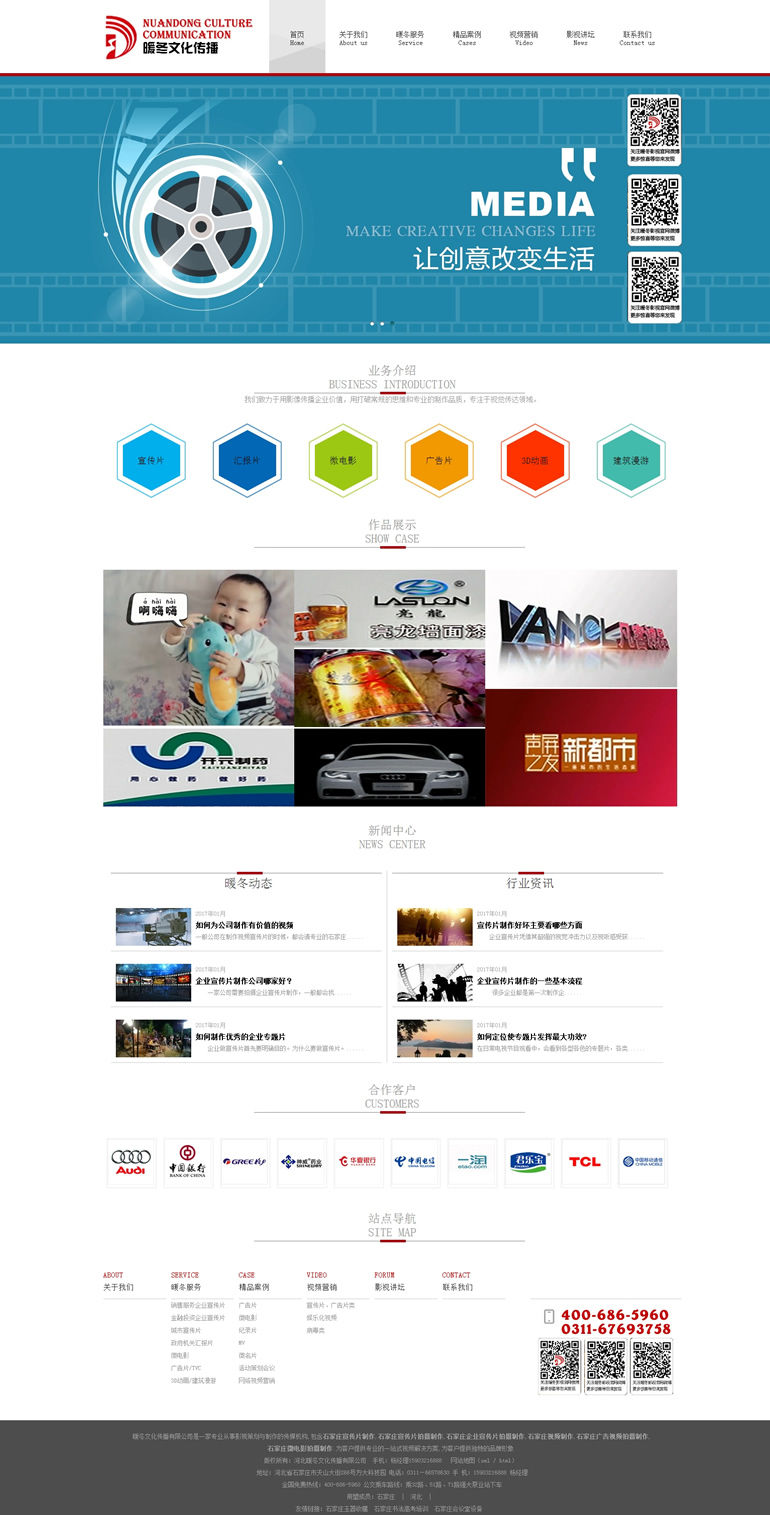 暖冬文化传播有限公司是一家从事影视策划与制作的传媒机构,包含企业宣传片、TVC、城市形象片、微电影、三维动画的策划拍摄 制作.为客户提供一站式视频解决方案,为客户提供不错的形象。我们一直秉持用诚挚、认真的态度对待每一部 作品,我们拥有策划、导演、拍摄、剪辑、动画、配音等一系列的人才所组成的影视团队。固化为业界性价比高、执行力强、信誉度大的创新型影视机构。我们秉持对企业、产品、市场、文化与设计的理解,以量身订做的理念为客户提供迎合市场口味及体现企业精神的服务,为您的企业和产品达成符合市场预期的 企业推广是我们始终如一的服务标准。